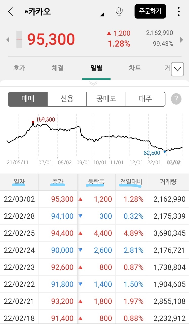 사실 차트 볼 것도 없이 증시가 시작하면 이 내용은 원하는 종목마다 다 떠 있습니다. 저는 나무증권을 사용하고 있는데 이해를 돕기 위해 카카오의 경우 표시되는 내용을 시가, 고가, 저가, 상한가, 하한가는 보시는 바와 같이 오른쪽에 떠 있고 종가는 보시 다시피 95,300원입니다